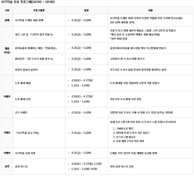 - 행사내용: 개막식, 도자기세일, 전시, 도자기체험, 공연 및 부대 행사