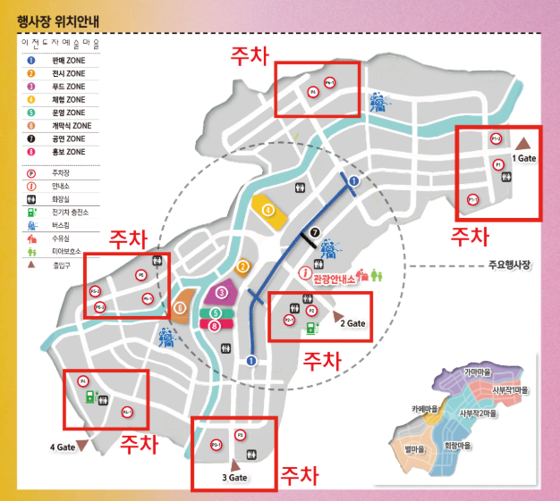 축제 기간에는 임시 주차장이 대규모로 운영되며, 차량 이용 시 아래의 주차장을 참고하세요.