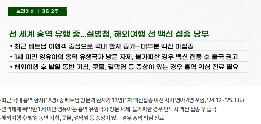 백신은 감염 예방의 핵심이자 자신뿐 아니라 타인을 지키는 수단입니다. 이번 여행을 건강하고 즐겁게 보내기 위해 출국 전 반드시 홍역 예방접종을 완료하세요!
